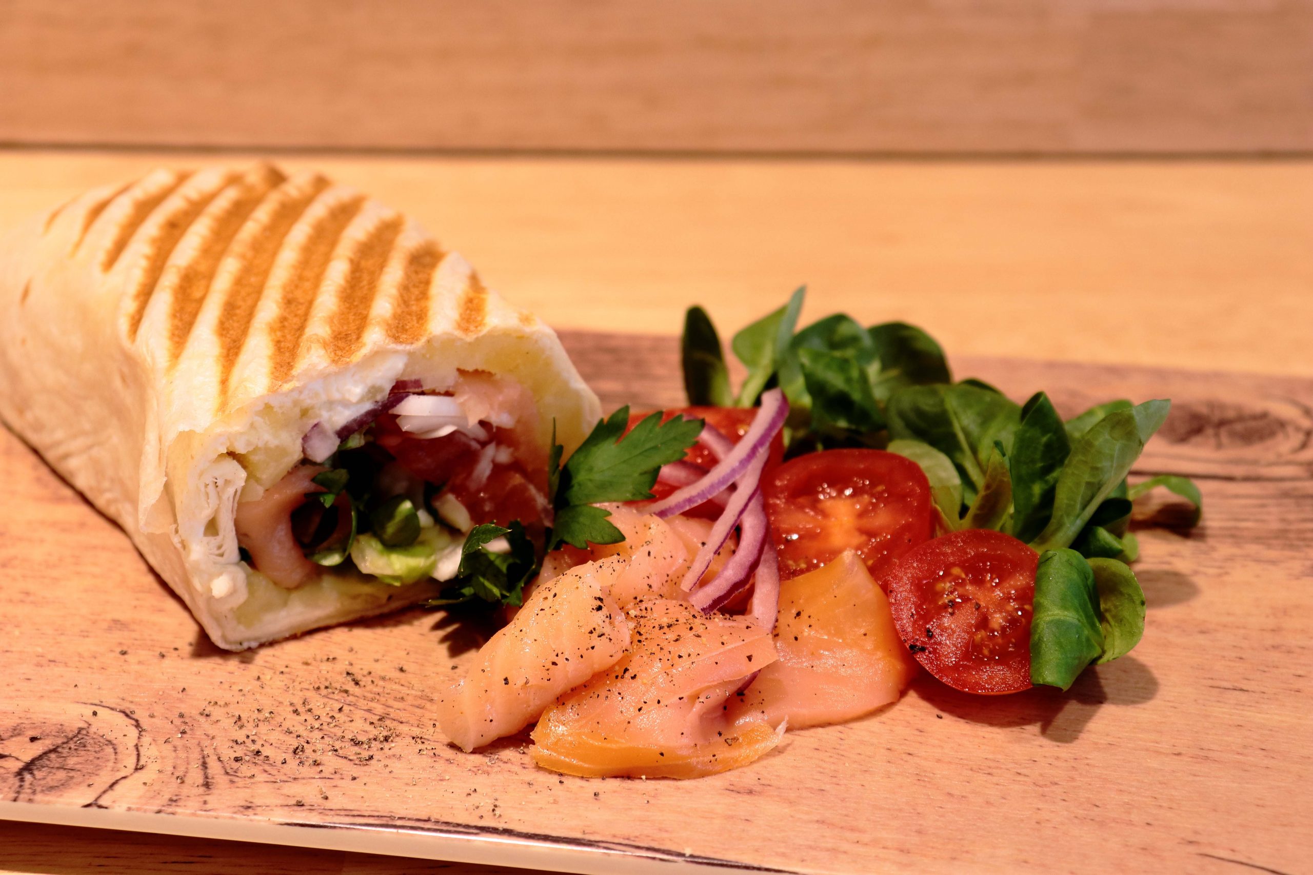 Weizentortilla gefüllt mit Caesar Sauce, Kartoffeln, Räucherlachs, Tomaten, roten Zwiebeln, Salat & Käse